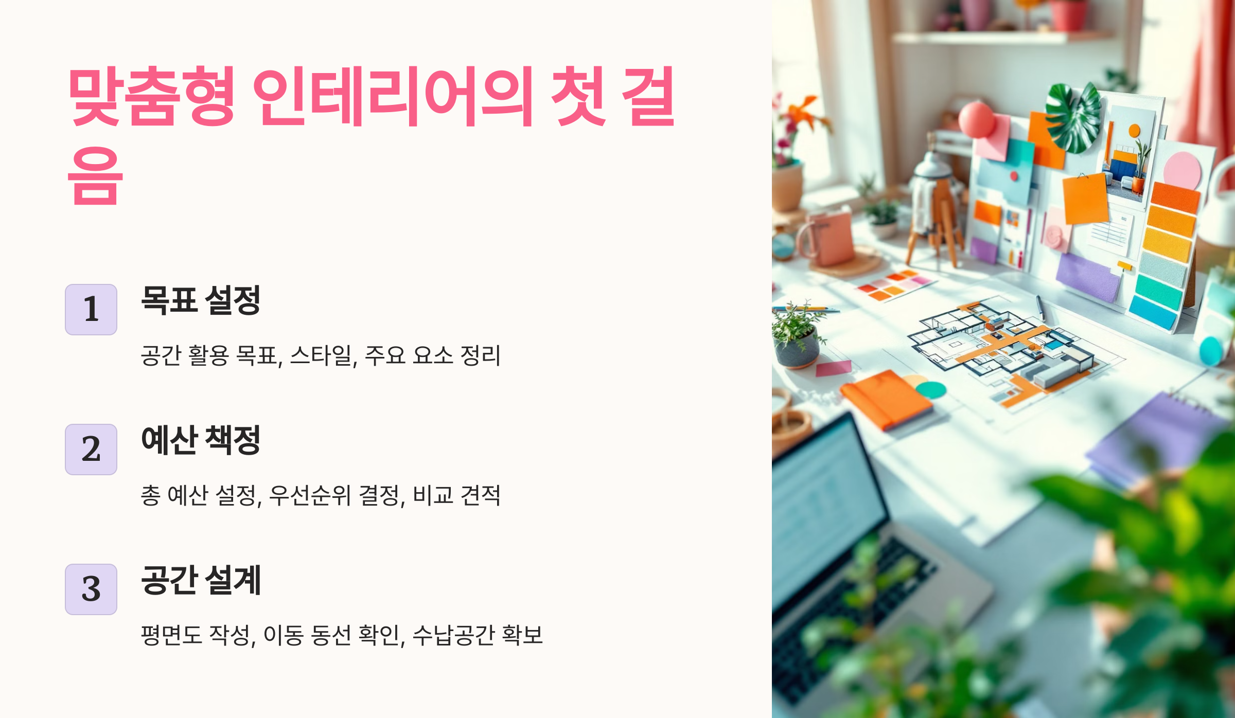 맞춤형 인테리어는 자재와 디자인에 따라 예산이 크게 달라지므로, 적절한 예산 책정과 우선순위 설정이 중요합니다.