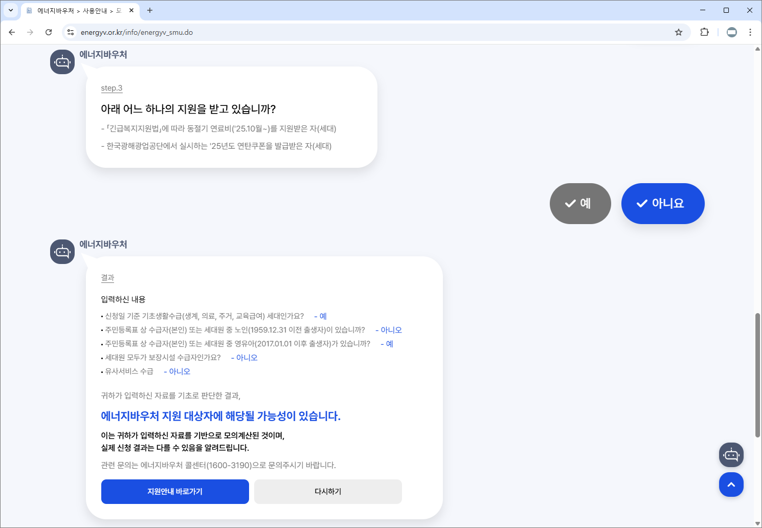 3️⃣ 결과 안내 메시지 확인 (예: “지원 대상일 가능성이 있습니다”)