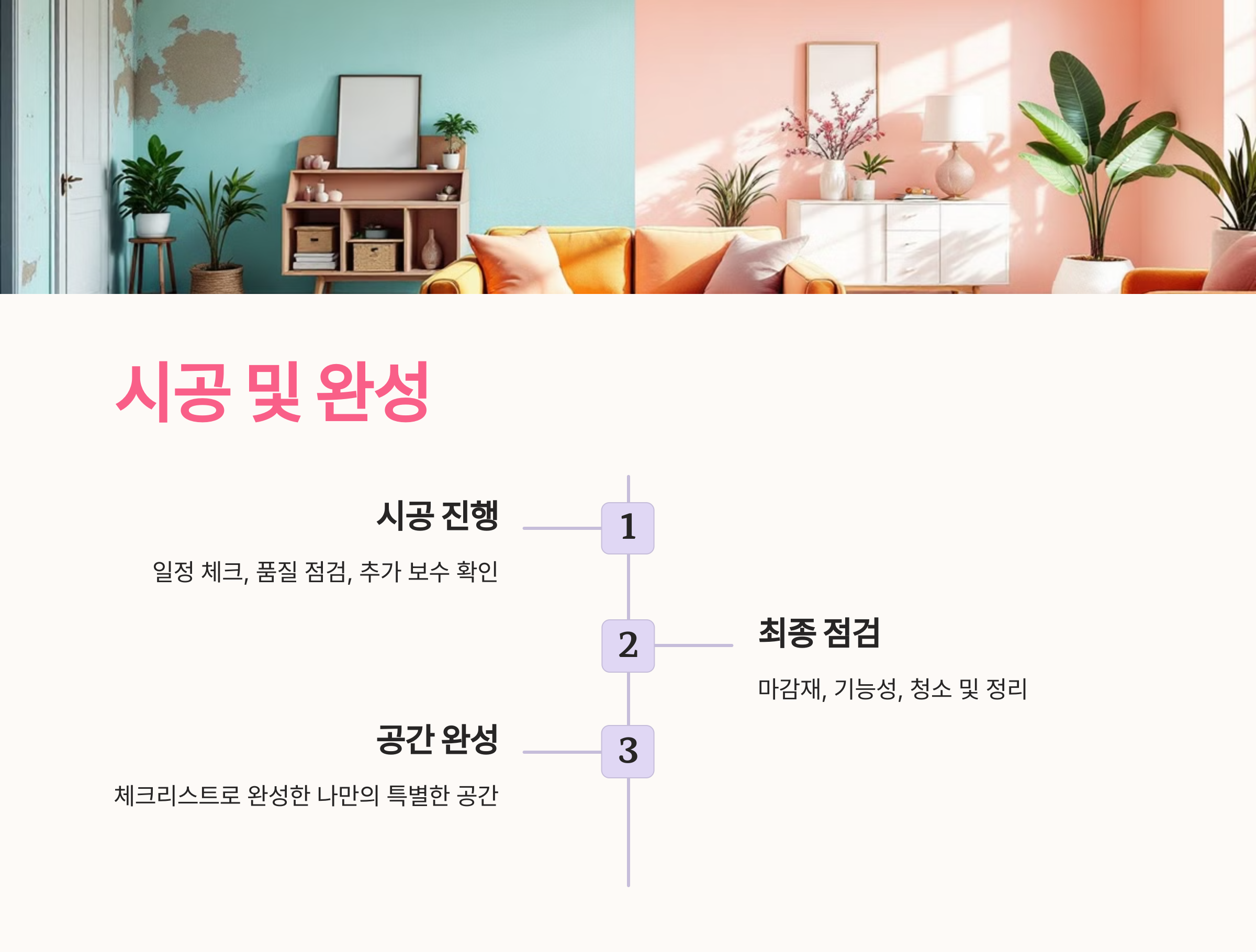시공이 완료되면 최종 점검을 통해 불편한 부분이 없는지 확인합니다. 이후 모든 정리가 끝난 후 가구 배치를 완료하세요.