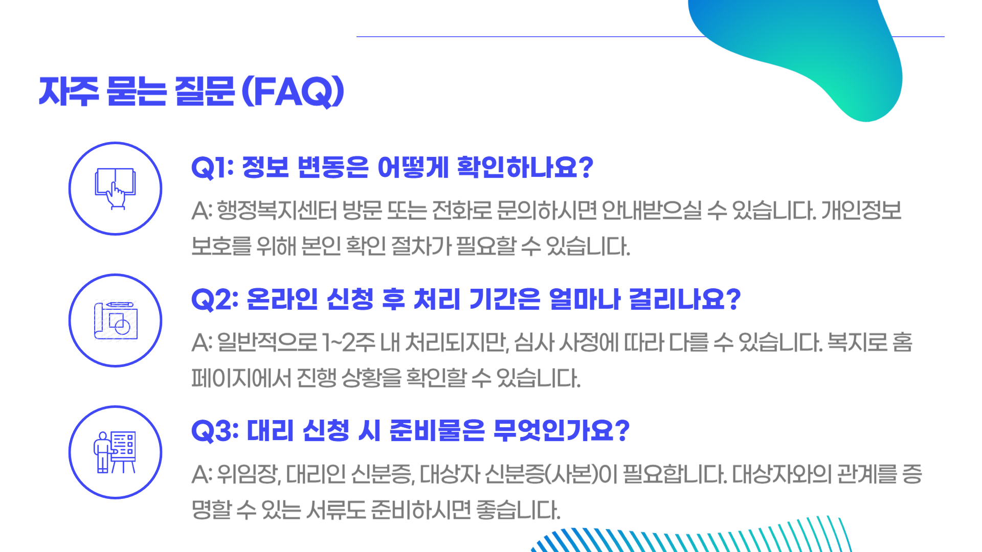 - 온라인신청 – 복지로(www.bokjiro.go.kr) 통해 신청 가능